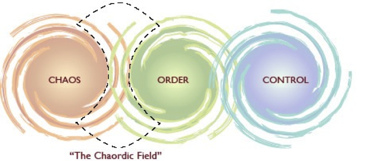 Originating with the work of Dee Hock in the development and evolution of Visa to an international network of financial institutions offering “one” credit card, Hock identified the patterns and forces of chaos, order and control that were at play in an animated process that came to the brink of failure at many points along the way.  It was clearly experienced that the greatest breakthroughs and emergent ideas came at the intersection of chaos and order, in a system that was more commonly situated in the realm of control.